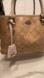 Elevate your style with the Coach Tan Signature Tote Bag. This elegant bag features a classic design with a spacious interior, perfect for everyday use. The tan color adds a touch of sophistication to any outfit. This Coach show sign of used as shown in pictures. Inside show light dark spot but no holes or major stain. Outside leather is clean and no scratches. One of the handles have cracks but only on the inside but no cracks on the leather and a little dirty so twilly is the answer to that. Corners in good condition. Please check pictures to avoid any issues.
