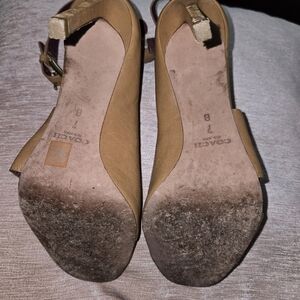 Elevate your style with these Coach wedges, featuring a sophisticated tan hue and elegant cross-over straps. The open design and subtle buckle detail make them perfect for warm weather outings. Experience the blend of comfort and chic design that Coach is renowned for.