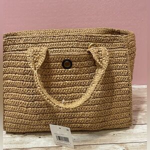 Chic Coach tote with woven design. Features bold black lettering. Perfect for everyday use.