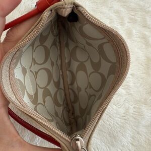 Stylish Coach canvas wristlet in tan with striking red accents. Perfect for carrying essentials. Excellent condition- no signs of wear.