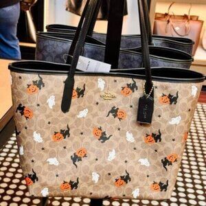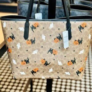 Chic tote with Halloween designs. Features pumpkins, ghosts, and cats. Ideal for festive outings.