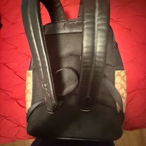 This Coach backpack showcases a sophisticated tan and black color scheme with a signature monogram pattern. Crafted from durable canvas and accented with leather details, it offers a structured, boxy shape perfect for everyday use. The vertical stripes add a touch of elegance to its timeless design.