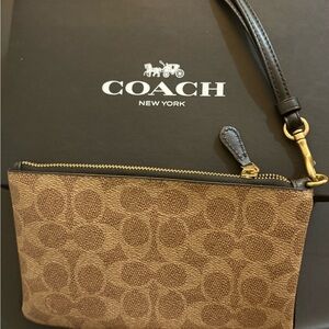 Elegant Coach wristlet with iconic logo pattern. Features tan and black design with a sleek strap.