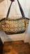 • It features the classic “C” signature canvas in khaki/tan with dark brown leather trim (bottom corners, straps, and detailing).