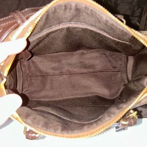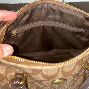 Chic Coach satchel with signature pattern. Features tan and brown tones. Ideal for everyday use. Comes with purse cover.