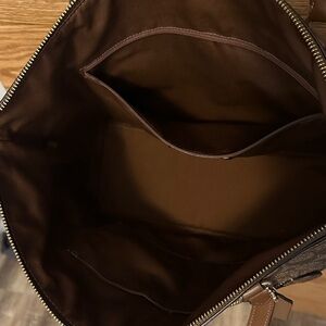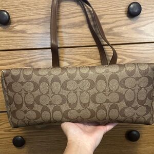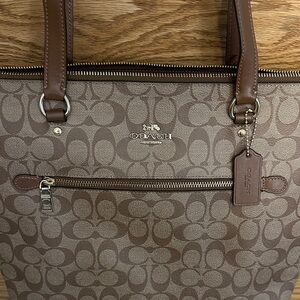 Stylish Coach tote with signature pattern. Features tan and brown hues. Perfect for daily use.