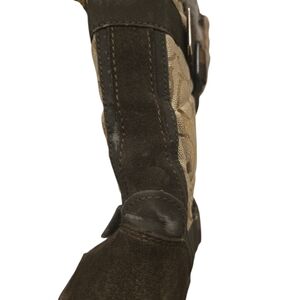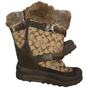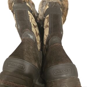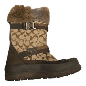 Step into winter with Coach's elegant winter boots, showcasing a tan and brown two-tone design. These boots feature a waterproof lower section and a signature Coach pattern on the upper, ensuring style and practicality. With a thick sole and mid-calf height, they provide excellent insulation and protection against the elements.