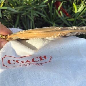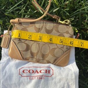 Elegant Coach wristlet with signature pattern. Features tan leather accents. Ideal for essentials. Excellent condition!