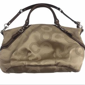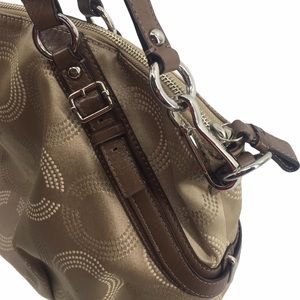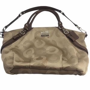 Stylish Coach bag with elegant pattern. Features dual handles and silver hardware. Perfect for any occasion.