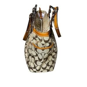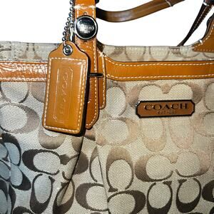 Coach Tan and Brown signature gallery shoulder bag canvas and patent leather