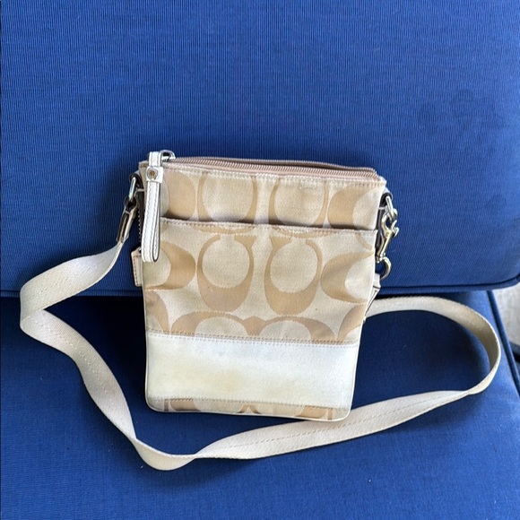 This Coach crossbody bag showcases the iconic 'C' monogram pattern in a sophisticated tan and cream palette. Designed for both style and convenience, it features a sleek silhouette with a white leather trim and an adjustable shoulder strap. The silver-toned hardware adds a touch of elegance to this timeless accessory.