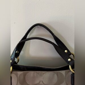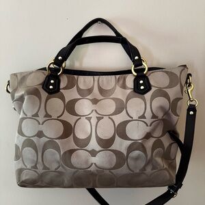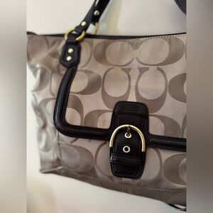 Stylish Coach tote with signature pattern. Features dark brown accents and secure buckle. Perfect for daily use.