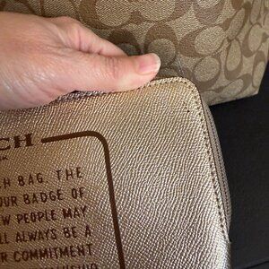 Stylish Coach shoulder bag with signature pattern. Features tan and gold tones. Includes matching pouch for added convenience.