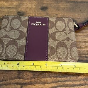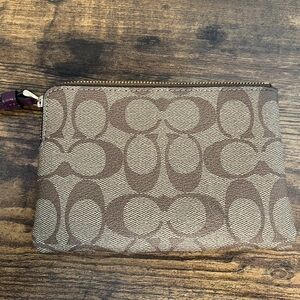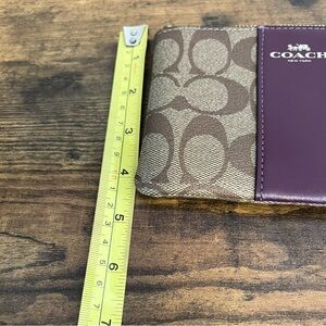 Elegant Coach wallet with iconic pattern. Features tan and purple design.
