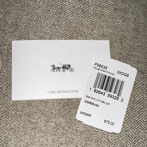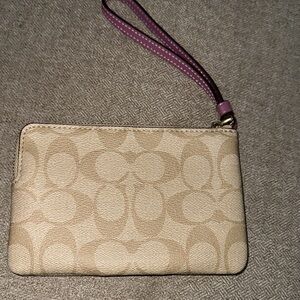 Stylish Coach wristlet. Features signature pattern. Tan body with purple accent. Perfect for essentials.