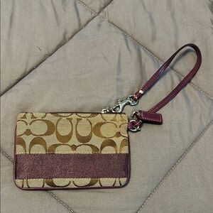 Elegant Coach wristlet in a stylish tan and purple design. Perfect for carrying essentials with ease and sophistication.