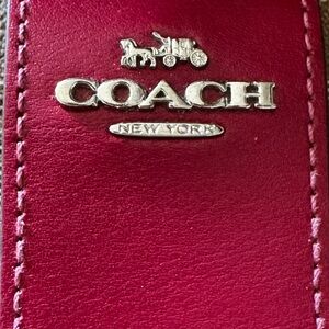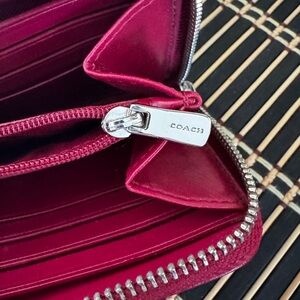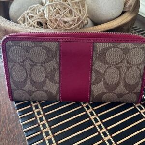 Pre owned in excellent condition! Coach wallet with signature pattern. Features a bold raspberry pink stripe and zip-around closure. Plenty of room for credit cards and cash ! Authentic. I purchased this at the coach store with a matching bag .