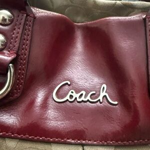 Elegant Coach shoulder bag in tan with striking red details. Ideal for versatile style. Minor and general wear on the fabric and corners. See photos