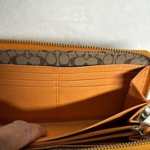 Elegant Coach wallet in tan leather. Features zip-around closure. Iconic logo on front. With signature pattern inside. See all photos as they are part of description. There is some wear on sides. See photos