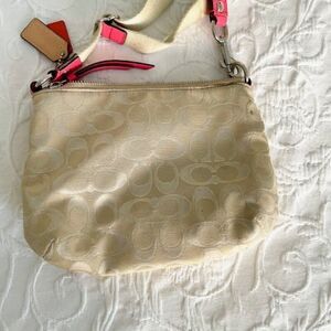 Coach Tan Cream Coral Cross Body Bag Signature Print Fabric Leather Purse