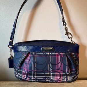 It's a small-sized bag with a zip closure and a wrist strap for easy carrying.