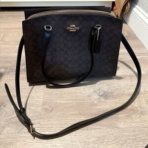 Stylish Coach shoulder bag with signature coach brown and black canvas print. Features zip closure and spacious interior. Has top handles and a detachable long crossbody strap to make it versatile as a shoulder bag or crossbody bag. Very spacious! Can fit 15” laptop. Only used a few times. EXCELLENT CONDITION!! Matching wallet is also for sale on my page.
