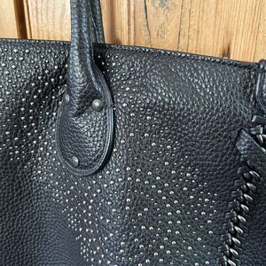 Description: Absolutely stunning oversized shoulder bag. Great for an overnight bag or trip. Slightly textured pebbled leather. Chain detail running around the perimeter of the bag with silver metal dots on the exterior. Stamped with the Coach logo. Removable tassle key chain with tags and feathers.