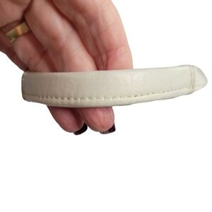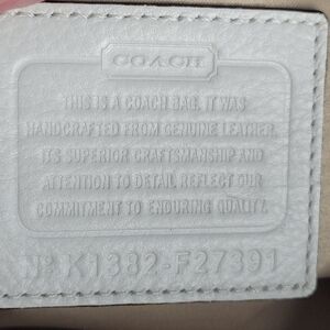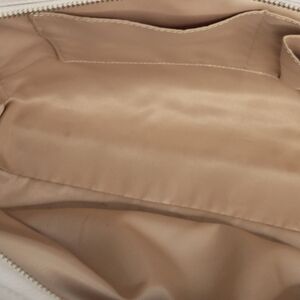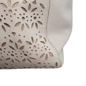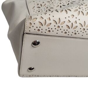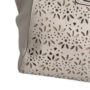 Cream/Off White color with laser cut out eyelets, tan interior that compliments thru the eyelets, zippered closure, zippered interior pocket and two slip pockets, overall this bag is in great condition, does have some wear on the corners, please review all photos, has feet to protect the bottom, silver hardware, original hangtag.