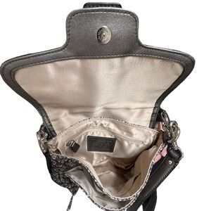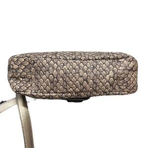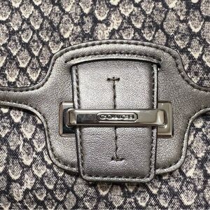 Python snake print fabric material with gunmetal grey metallic leather trim. Inside zip and multi function pockets.