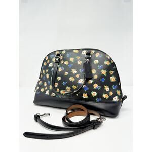 Coach Mini Sierra Satchel in Tea Rose. Black floral design with peach, pink, and blue flowers. Zipper top, with optional bag strap to wear as crossbody. Leather material with no wearing. Silver hardware/metal. Smoke free home. Handles have been replaced. Some wear and marks inside bag.