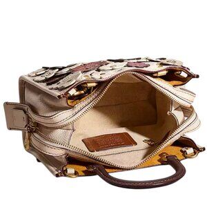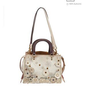 In Stores Now. Ivory glove-tanned leather Coach Rogue 25 satchel with gold-tone hardware, dual rolled top handles, dual removable shoulder straps, dual exterior compartments, Tea Rose appliqué throughout, natural canvas lining, dual interior pockets; one with zip closure and zip closure at top. Shoulder Strap Drop: 12". If you attach both you can convert it as crossbody