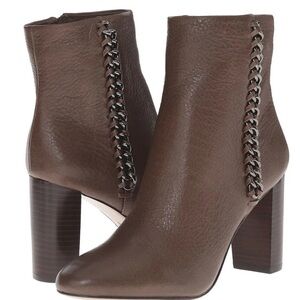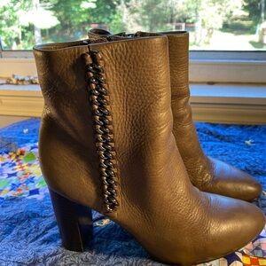Coach Teagan leather ankle boots in tobacco size 7.5. 3.5 inch stacked heel. Supple pebble grain leather chain accent inside zip close.