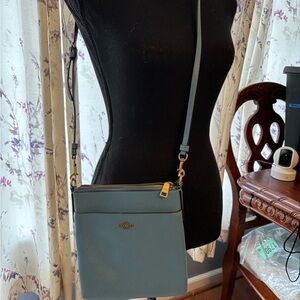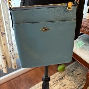 Elegant Coach crossbody in teal. Gold-tone hardware and zipper. Compact and stylish.