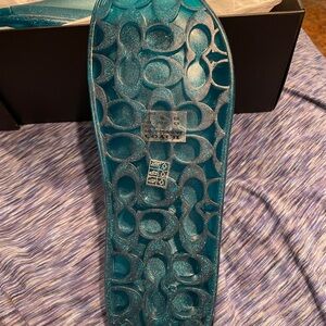 Stylish teal slides with glitter embedded. Perfect for casual wear. Have amazing sparkle. Come with original box. The box has been written on for storage. Decided to get rid of some of my shoes I never wear.