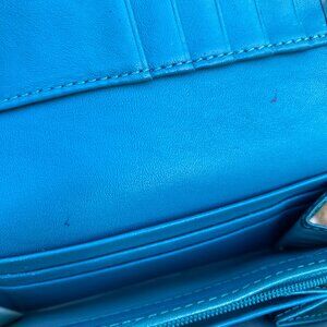 The photos shown are a bit darker than actual. The cover photo is closest to the real color which is teal. This COACH wallet comes with plenty of compartments including several card slots on the top flap, a few on the inside pocket and a zippered pouch with two compartments great for coins and other small items. Also has an additional pouch on the back of the wallet. There is minor rubbing and stains on bottom corners, but otherwise this wallet is in great condition. Clean inside and out with very minor stains/markings likely pen marks. Measures 5.5 x 4 inches.