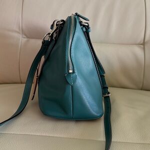 Stylish teal satchel with sleek design. Features durable straps and silver accents. Perfect for any outfit.
