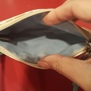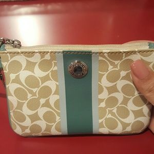 Barely used Coach wristlet you can wear with anything. Teal and tan logo print with silver hardware.
