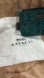 Chic Coach wristlet with a teal pattern. Perfect for versatile styling. Compact and fashionable.