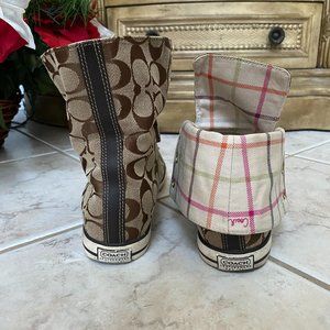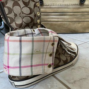 High top tennis shoes with the classic Coach design. This shoe has a fun striped lining that can be seen when the uppers are folded down. Comes with original box.
