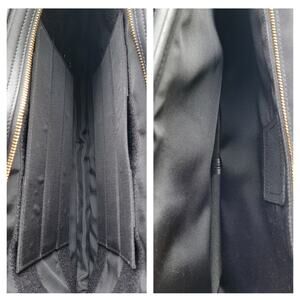 Interior has two full size open compartments, one card slot, three slide in and one zip pockets