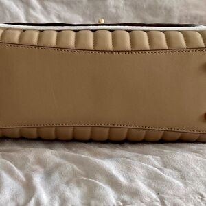 Coach Tilly top handle crossbody bag with linear quilted lines Gold tone logo and hardware, monochromatic hangtag & and golf script logo on the side of bag. Very minor scratches on feet which were there during purchase.