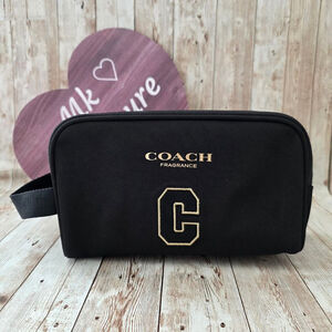 This is a Coach Fragrance toiletry bag, new without tags or box. The exterior is black canvas with gold embroidered "COACH FRAGRANCE" lettering and a "C" emblem. It features a zippered closure and a small black handle on one end. The interior is lined with black material and appears to be in pristine condition.