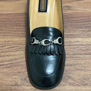 Coach Toni logo genuine black leather pump kiltie loafer with matte silver tone horse bit. Featuring block heel, leather lining, innersole and outsole.