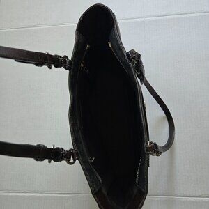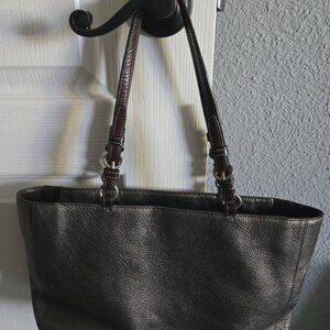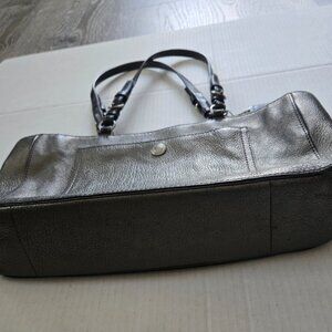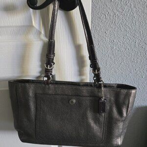 Authentic Coach vintage tote. Metallic sliver/gray body with chocolate brown straps. Exterior has a very roomy snap front pocket. The inside interior is lined in a chocolate colored material with no stains or tears. Interior has one zipper pocket and two slide in pockets. The tote is a nice roomy bag. The tote is made of a nice grain leather. There are a couple of markings (only noticeable up close), but still in a very nice condition that will provide many, many more years of use. Leather straps have no tears or markings and tote has been kept in a dry location and a non-smoking household.
