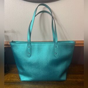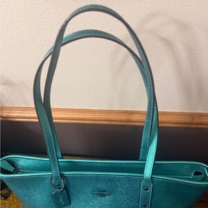 Sleek, spacious, and eye-catching! This Coach City Tote in a stunning metallic sea green is perfect for everyday use, work, or travel.