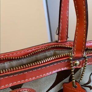 Color is coral. Some stains and slight fraying of the handles (see pictures) dimensions: length 11” height 8.5” straps 7.5”