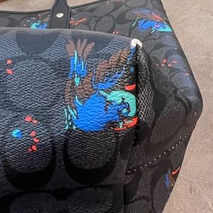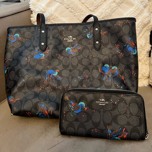 Black Coach tote bag with colorful bird design and matching wallet