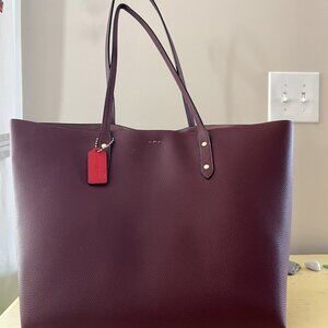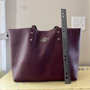 A Coach Town Tote in wine burgundy, made of pebbled leather. The interior is spaces with a small zip pocket. The bag shows signs of use on the interior lining at the bottom, but the exterior looks perfect.