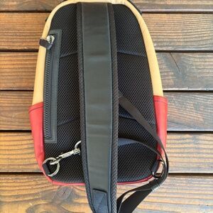 This modern and compact Coach Track Sling Pack is crafted in soft leather and smooth colorblock panels, combining tan, ivory, and red tones for a bold, sporty look. It features a minimalist design with utility-style zip pulls, a front vertical zipper pocket, and the iconic Coach logo on the front. Excellent used condition – clean inside and out.