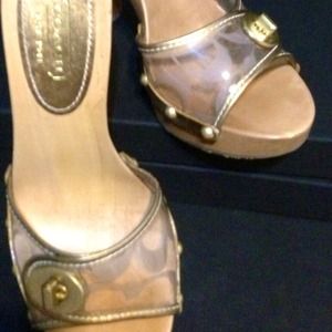 Good as new sexy transparent monogram sandals with gold leather pipings. Can be worn with any color!